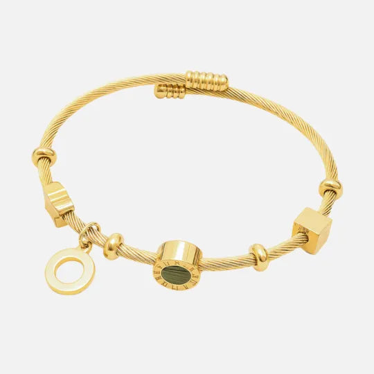 Forjada em aço inoxidável dourado — símbolo de firmeza e longevidade — essa pulseira é um amuleto de presença e magnetismo.